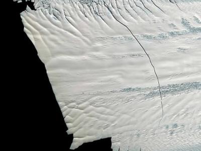 最新航拍照片显示,2011年11月南极洲松木岛冰川出现19英里长的裂缝,该照片直到2...