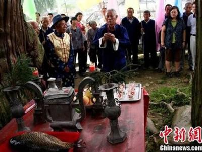 村民代表向老死的鲤鱼敬香 鱼祭司给老死的鲤鱼敬酒 一位老者双手托起老死鲤...
