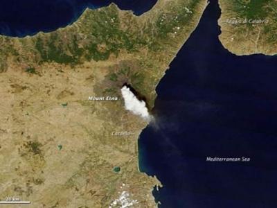 这是美国宇航局“大地”卫星于8月12日拍摄的埃特纳火山爆发的真彩色图像。可以看...