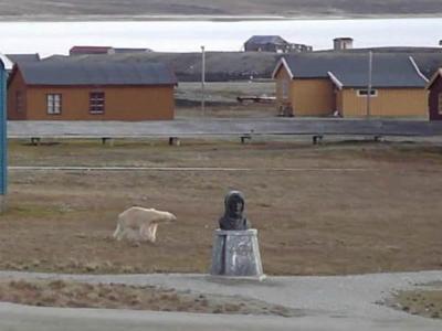 北极熊向极地探险家阿蒙森的雕像走来(北极黄河站2011年夏季考察队拍摄) 北极熊...