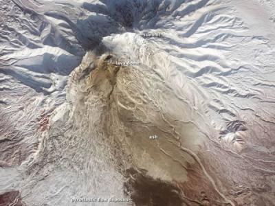 这张由美国宇航局拍摄的图片,显示的是俄罗斯思维纳弛火山坡上的火山灰流。 位...