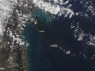 这张图像是由美国宇航局“海洋”卫星拍摄的。图像中可见3月11日日本强震之后仙台...