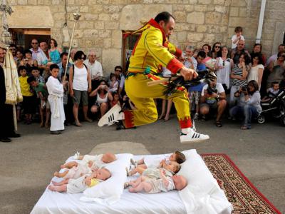 在穆西亚城堡的跳婴儿节中,象征魔鬼的男子从婴儿身...
