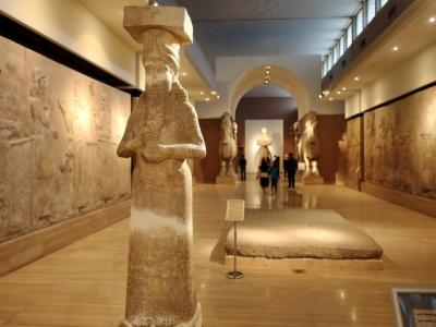在巴格达的伊拉克国家博物馆里,游客走向亚述时期展区入口两侧的有翼公牛雕像。这...