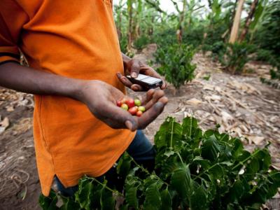 乌干达的一个农民,利用手机查询国际咖啡价格。 Photograph by Trevor Snapp, Bl...