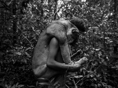 Awa-Guaja部落成员Klby肩膀上抗着打猎的成果:一只美洲豹。 Awa-Guaja部落成员...