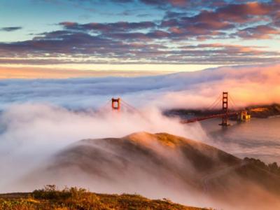 洛杉矶金门大桥在云雾笼罩下的日落美景