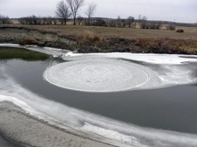 美国北达州河流发现直径近17米旋转大冰盘