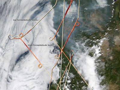 飞行测绘地图显示美国大型野火散发出来的烟雾中的甲醛浓度 据新浪科技:美国国家...