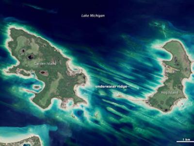 卫星照片展示美国密歇根湖花园岛和猪岛的面貌 卫星照片展示美国密歇根湖花园岛...