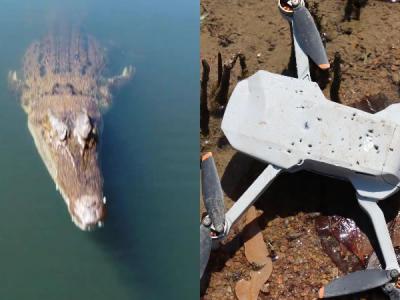 澳洲广播公司摄影师在鳄鱼公园拍摄纪录片时 湾鳄从湖中跃起咬住空中无人机拖回湖里...