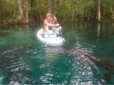 美国佛罗里达州女子在河里划船遇到巨大鳄