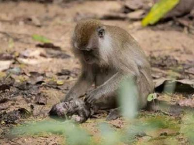 新加坡最大水库麦里芝蓄水池附近猴子妈妈轻抚已死亡幼猴的尸体(神秘的地球uux.cn报...