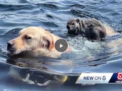 美国麻萨诸塞州黄金猎犬在希克里山湖游泳时一只土拨鼠骑上背部搭便车(神秘的地球u...