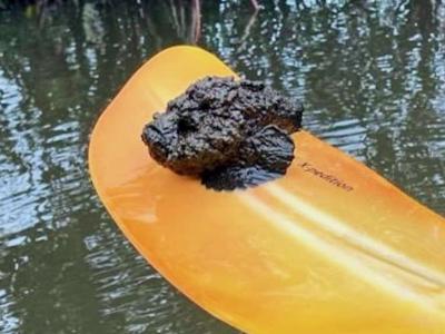 澳洲游客划独木舟时挖起一团“烂泥巴”
