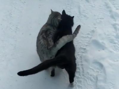 乌克兰雪地中一只黑猫和一只虎斑猫紧紧依偎走路 连尾巴都交叉(神秘的地球uux.cn报...