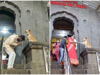 印度马哈拉施特拉邦一只小狗经常坐在施地维纳雅克庙门前跟信众“摸头握手”送祝福(...