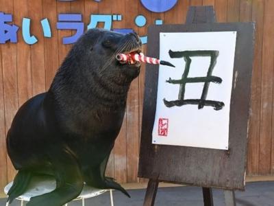 日本神奈川县横滨市八景岛海岛乐园人气海狮里奥挥毫练书法 “丑”字迎牛年(神秘的...
