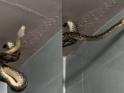 泰国男子在家上厕所时发现天花板上垂着一条巨大蟒蛇(神秘的地球uux.cn报道)据ETt...