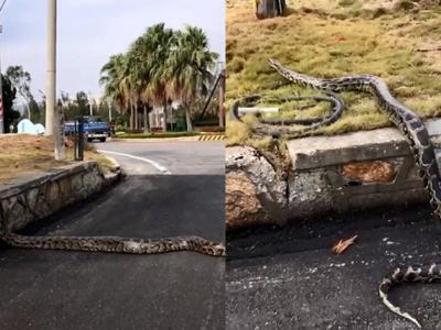台湾金门网友巧遇2公尺巨蟒过马路 鳞片在