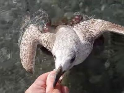 法国男子在海滩发现海鸥被章鱼吸住拖入水
