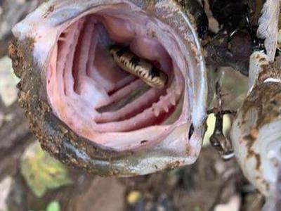 美国田纳西州钓客在河里钓到鲈鱼 打开其嘴巴发现里面竟藏有一条小水蛇(神秘的地球...