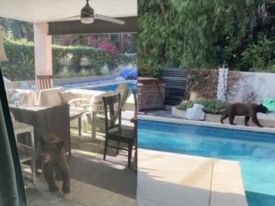 美国加州小熊闯民居后花园 拍门吓惊女主人
