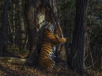 俄罗斯摄影师拍摄到西伯利亚虎抱着满州杉树照片 获2020国际野生动物摄影奖最高殊荣...