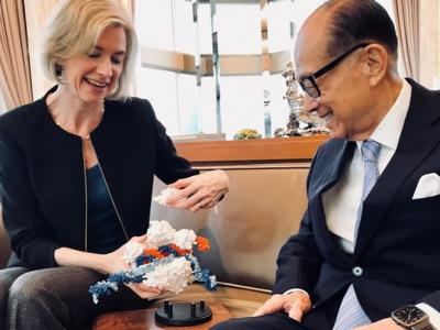 杜娜(左)以模型向李嘉诚(右)展示编辑DNA过程。(神秘的地球uux.cn报道)据东网...