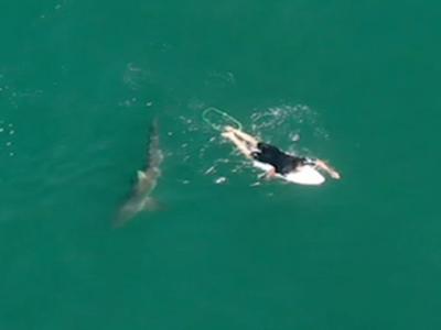 澳洲知名冲浪运动员Matt Wilkinson在夏普斯海滩冲浪遭大白鲨盯上 无人机发警告脱险...
