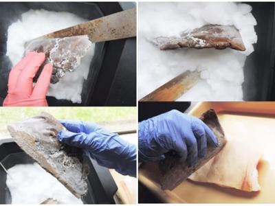 有团队将人粪冷冻后制成刀切肉实验,夺得“物料科学奖”。主持人展示纸制奖杯。各研...