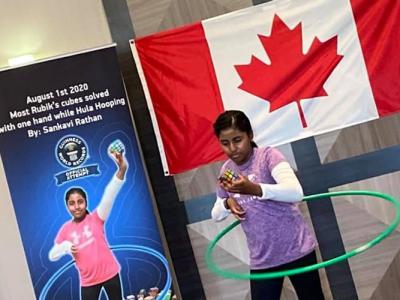 加拿大11岁印度裔女童Sankavi Rathan边转呼拉圈边单手还原魔方创吉尼斯世界纪录(神...