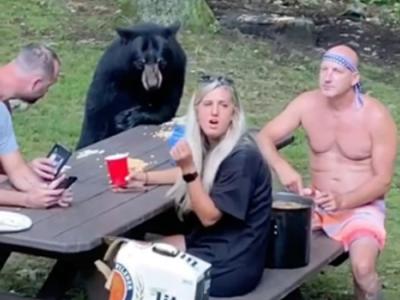 美国马里兰州游客在树林附近野餐 一只黑熊加入享用桌上食物(神秘的地球uux.cn报道...
