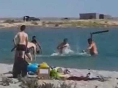 哈萨克斯坦城镇库里克游客到海边游玩 为让孩子拍照竟拿起棍棒...
