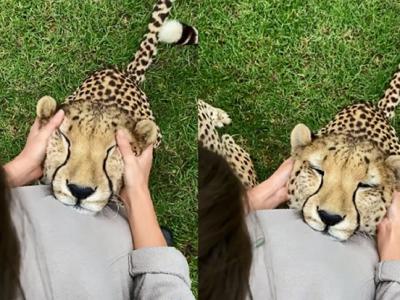澳洲雪梨动物保护区猎豹Duke跑去找保育员