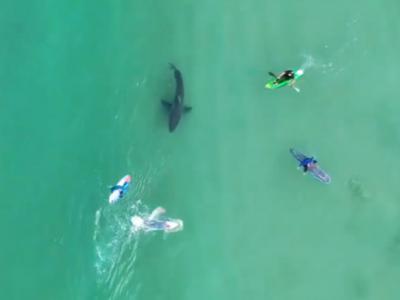 南非航拍机拍到大白鲨游向冲浪客身边“调