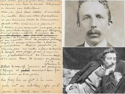 梵高(右图上)与高庚(右图下)写给班纳特的信(左图)将于巴...