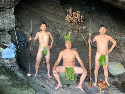 众人扮成原始人拍照留念,场面引人发笑。Ken会潜水捕鱼。活鸡...