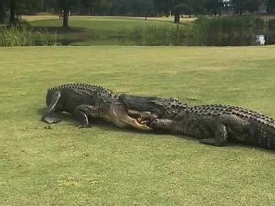 美国南卡罗莱纳州高尔夫球场 两条巨大鳄鱼在草地上互咬扭打长达2小时(神秘的地球u...