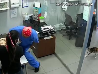 兽医诊所内猫咪不忍小狗挨打针 “路见不平”扑上兽医大腿上咬...