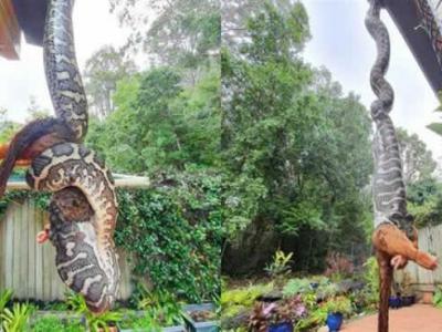 澳洲男子惊见屋外面倒挂巨蟒生吞袋貂