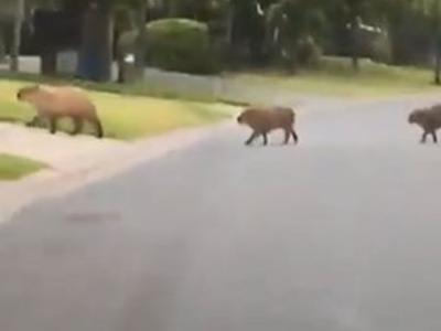 停车等3只水豚过马路 后方居然还有一群一开始以为只有3只水豚...