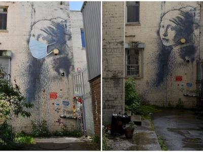 Banksy原作《穿耳膜的少女》(右图)中的少女被戴上口罩(左图...