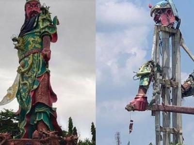 印尼东爪哇号称东南亚最大的关公像突然倒塌