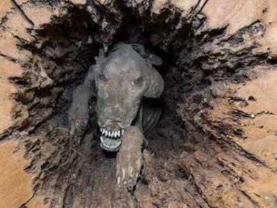 美国猎犬塞得奇Stuckie追捕浣熊时卡在中空树干内活活饿死 风干...