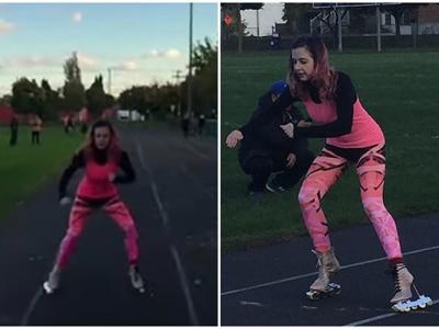 加拿大女子穿高跟直排滚轴溜冰鞋以21.52