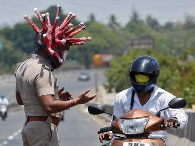印度警察竟戴新冠病毒头盔吓阻民众回家