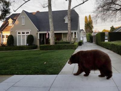 美国加州大黑熊闯入洛杉矶小镇到处闲逛