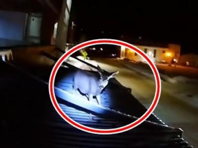 美国怀俄明州小鹿被困屋顶 爱心警员冒险