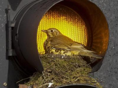 今天红绿灯特别糊?英国利兹槲鸫一家在上面筑巢(Picture: SWNS)(神秘的地球uux.cn...